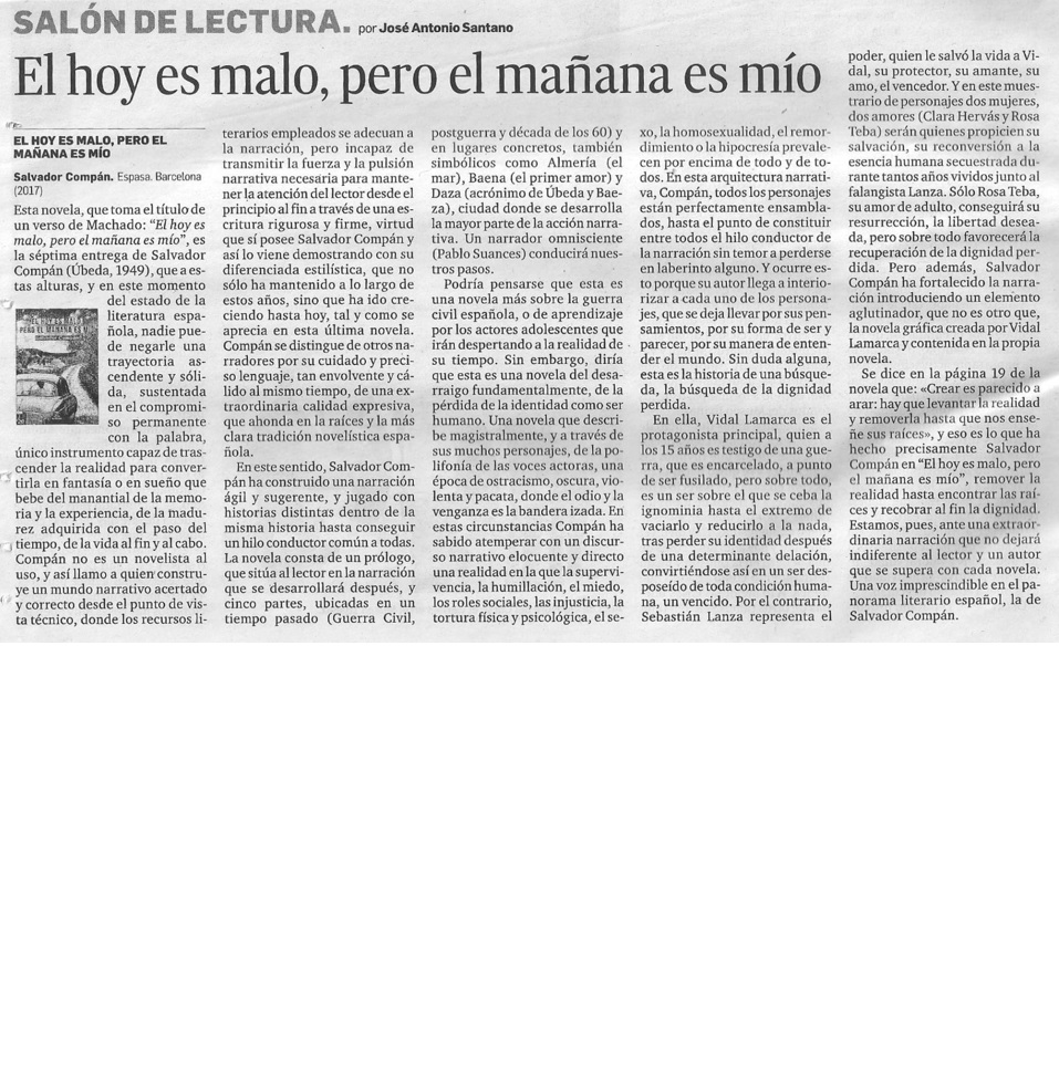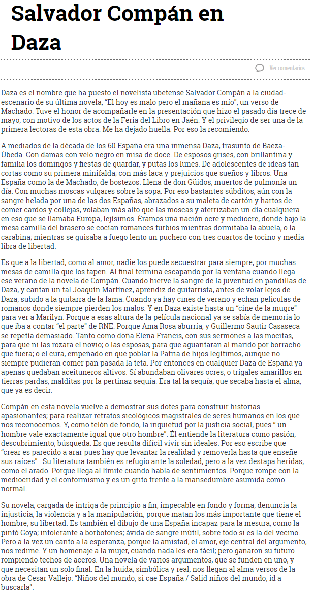 Salvador Compán es, junto a su paisano ubetense Antonio Muñoz Molina, uno de los escritores más serios y rigurosos del panorama actual. Con su última novela, “Palabras insensatas que tú comprenderás” (Editorial Almuzara, Córdoba, 2012), se adentra en una intriga de personalidades desdobladas sentimental a varias voces con la que consigue profundizar en el alma humana, sus contradicciones, sus desafíos, sus podedumbres, su irrelevancia y su poder de destrucción a la vez que aspira a dirimir los tenues puentes existentes entre la ficción y la vida… No es un simple libro sino una novela compleja con muchas hendiduras y mucha profundidad… Es una novela muy bien estructurada, ágil, con un ritmo que permite (a pesar de la tendencia al solipsismo, la evanescencia y la meditación incierta) continuar con soltura y profundidad sus comedidas reflexiones y sus adecuados ritmos. Es uno de los elementos que enseguida aceptamos como determinante del proceso narrativo solvente… Hay una perfección de relojería suiza en esta obra que nos permite decir que se trata de una novela muy bien trabajada, perfectamente diseñada y, como una buena maquinaria de escrupulosidad, perfecta en la organización y ensamblaje de sus elementos… La construcción de la realidad personal y el papel aparentemente secundario de la mujer (habría que decir que primario en este caso) así como la singladura sentimental de afectos y contradicciones configura una de las mejores novelas de Salvador Compán. (Francisco Morales Lomas en "Literatura Española Actual. La creación literaria y el escritor")