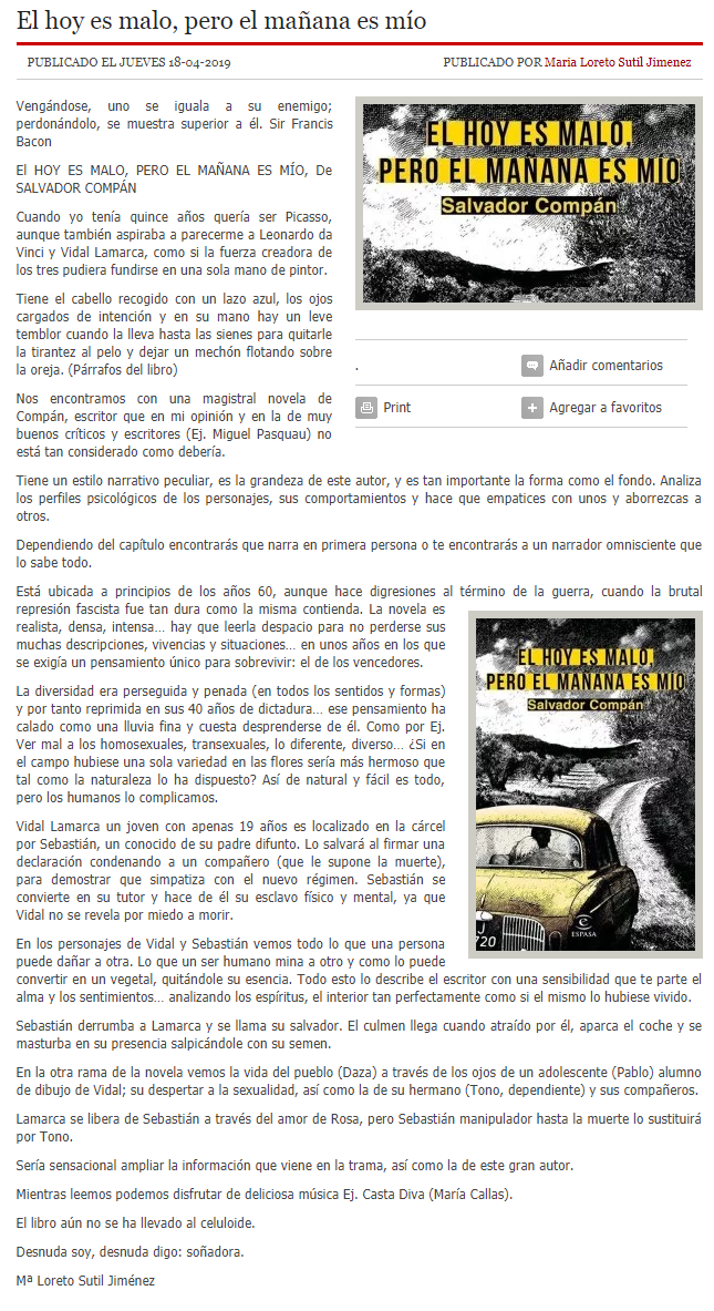 Se observa una gran seguridad en el narrar, una necesidad de bucear en la mayor expresividad del lenguaje, un profundo amor hacia el castellano bien dicho que permite siempre situarse en el mejor término o en la frase más estudiada. Lo que me lleva a decir que, como Gabriel Miró, Compán es un orfebre del idioma, un escritor lleno de sensualidad, calidad y gran imaginación que convierte en literatura todo lo que toca.